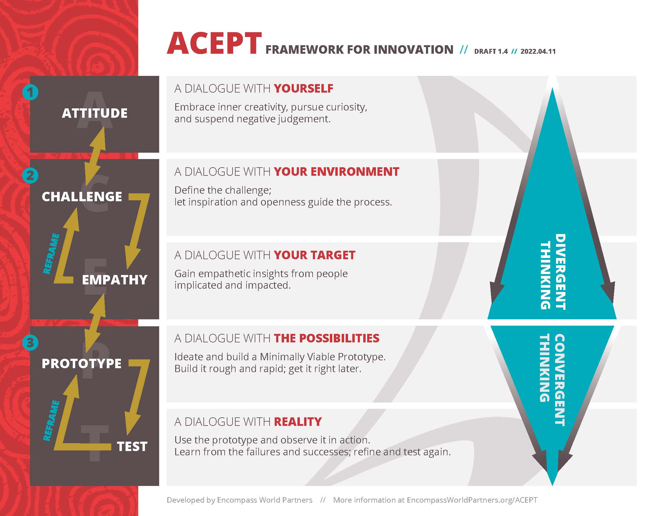 Encompass staff are encouraged to utilize the ACEPT framework in their innovative ministry efforts. And the framework is supported by in-house innovation strategists, who guide our staff members in its use.