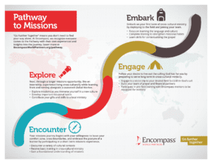 We use Encounter, Explore, Engage and Embark to describe ministry opportunities of short, mid, and long-term durations. Much more than isolated experiences, these opportunities are how we commit to develop you personally and professionally over time, so you’re prepared to flourish in a life of ministry. To learn more, download the PDF below or visit our Pathway to Missions page.