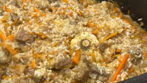When it came time to host the second family, they chose to serve beef plov (photo right), which is a staple in Central Asia. The dish is made of beef, rice, and spices, and it is often accompanied by specific salads and bread. So the team prepared a carrot salad and two other salads with tomatoes, cucumbers, and onions, along with Russian flatbread. The preparation and serving of the meal brought everyone together, fostering a warm sense of community and shared purpose.